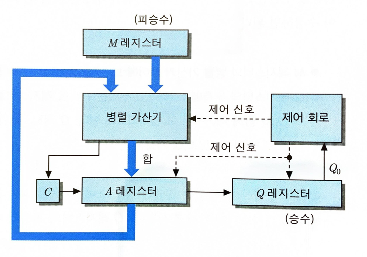 C, A, Q 레지스터가 직렬로 연결되어 시프트되면서 연산이 이루어짐. 제어회로에 의해 피승수(multiplicand)만큼 더할지, 0을 더할지 결정됨.
