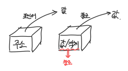 포인터는 메모리의 주소를 참조하는 것에 반해서 참조 변수는 메모리의 객체나 값을 참조함.