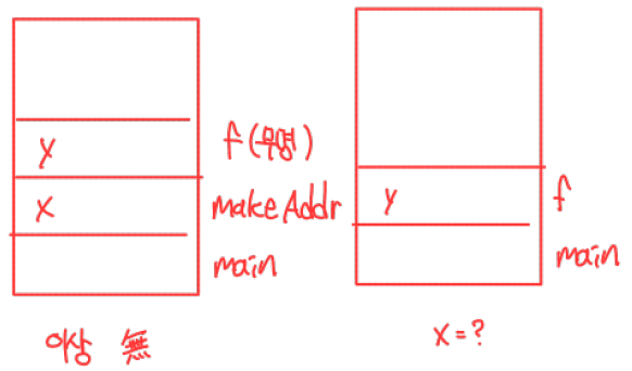 만일, 이런 일이 발생한 경우, 호출된 부프로그램을 포함하는 (종료된) 부프로그램에서 정의된 변수는 해제되기 때문에, 호출된 부프로그램이 해제된 변수를 접근할 수 없는 문제가 발생함.
