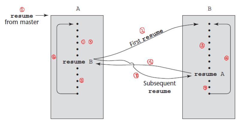 co1이 처음 리쥼될 때, 실행은 첫 문장에서 시작하여 "resume co2()"까지 실행하고 co2에 제어를 전달함.