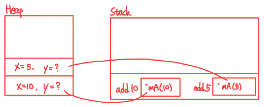 힙 공간에 x를 저장해 두고, 스택에는 그 주소를 저장해 둠. 덕분에 나중에 호출되었을 때, 불러와서 사용할 수 있게 됨.