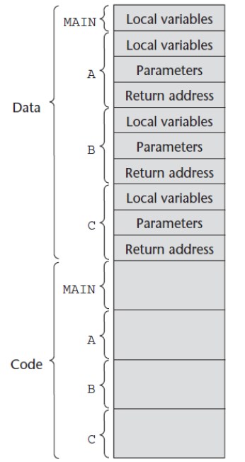다음 그림은 주프로그램 MAIN과 세 개의 부프로그램 A, B, C으로 구성된 프로그램에서의 프로그램 코드와 활성화 레코드를 보여줌.