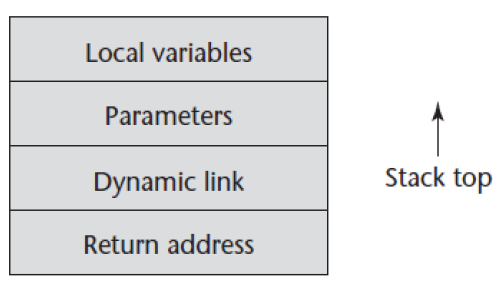 위 그림에서, 첫 지역 변수는 활성화 레코드의 시작 지점으로부터 (매개변수의 개수 + 2) 위치에 할당됨. "+2"는 복귀 주소와 동적 링크를 위한 장소가 각각 1개씩 필요하기 때문.