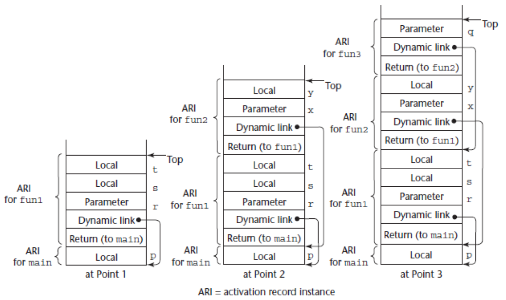 ㄴ 스택 동적 지역 변수를 사용하는 언어에서의 부프로그램 연결이 단순 부프로그램에서보다 더 복잡한 이유