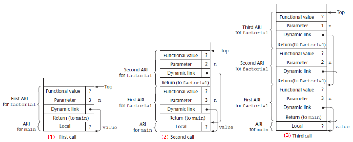 각각은 함수 값이 정의되지 않은 ARI를 가지고 있음. 첫 번째 ARI는 호출자 main의 복귀 주소를 가지고 있음. 다른 ARI는 함수 factorial에 대한 복귀 주소를 가지고 있음.