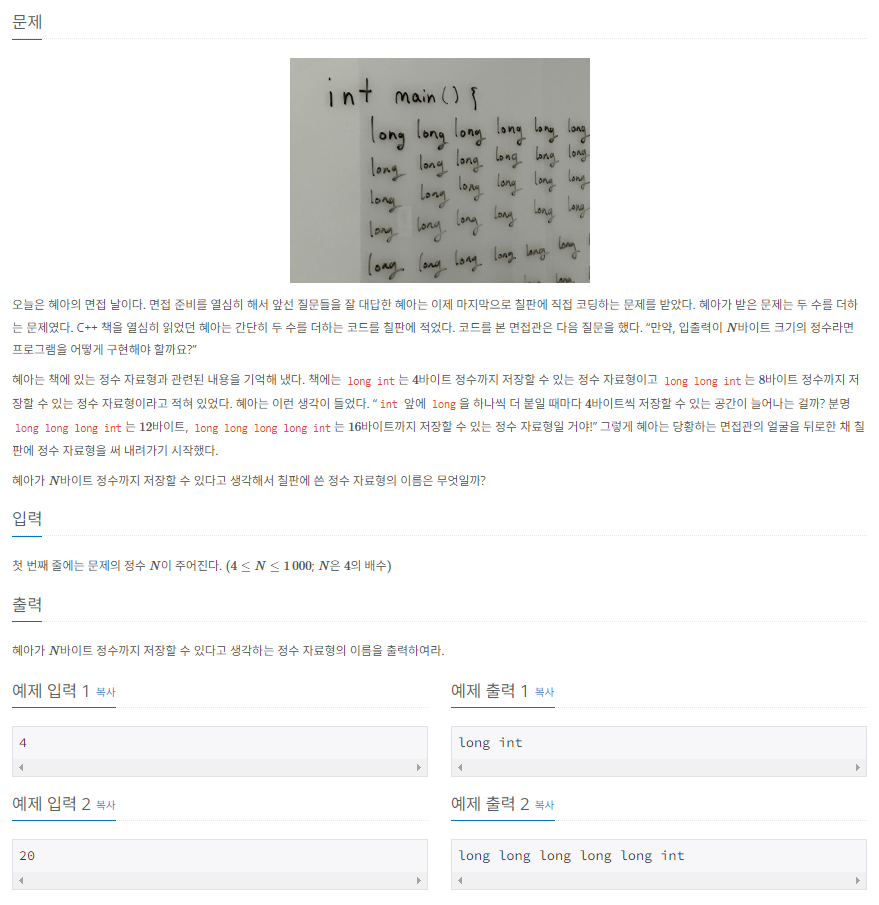입력으로 들어온 숫자를 4로 나눈 몫 만큼 "long"을 출력하고 뒤에 "int"를 붙여주면 된다.