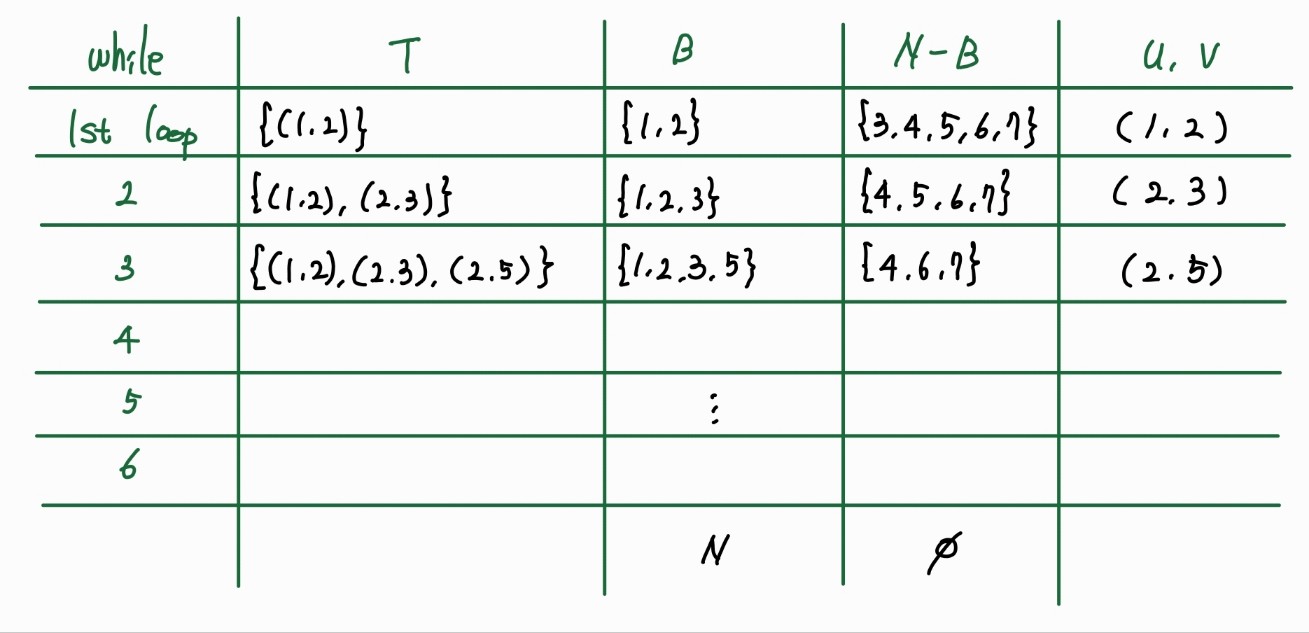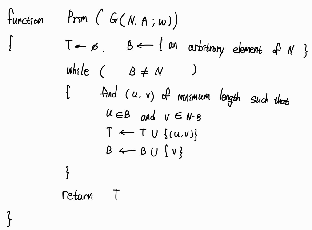 각각의 단계에서, 알고리즘은 가능한 최소의 간선$(u, v)$을 찾아냄. 여기서 $u\in B$이고, $v\in N-B$임.