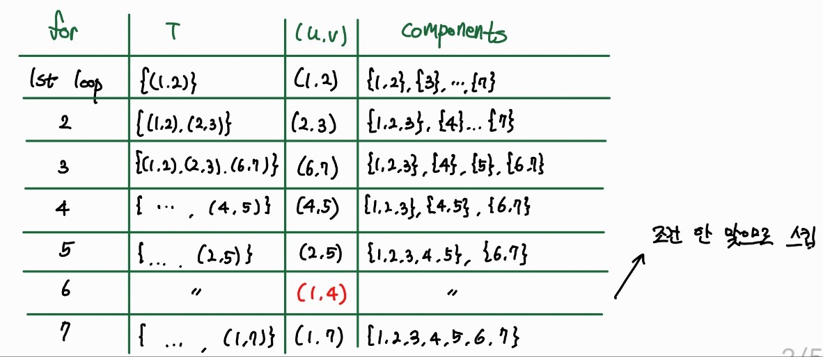 반복문이 진행될 때마다 $T$, $(u, v)$, 컴포넌트 상황은 다음과 같음.