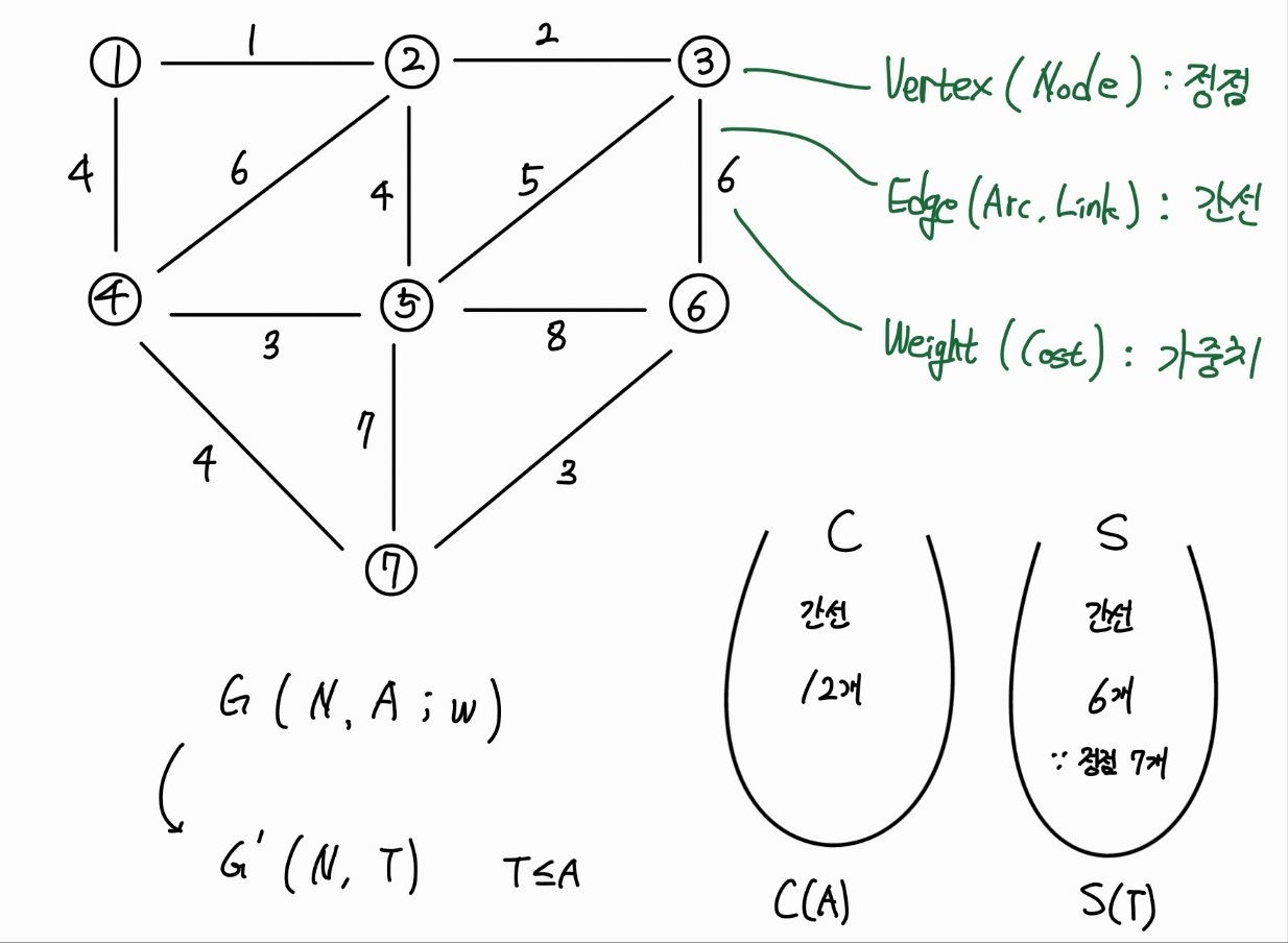 $T\leq A$이며, 간선들의 가중치 합은 최소임. 즉, $\sum_{e \in T} w(e) $가 최소임.