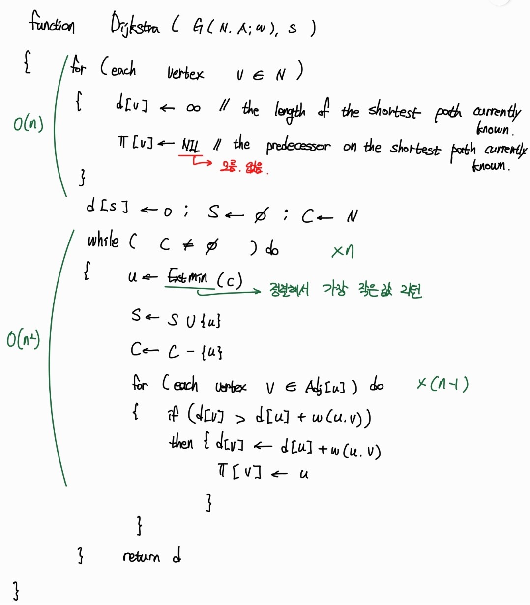 알고리즘은 반복적으로 정점 $u(\in N-S)$를 선택해 최단 경로를 추정하고, $S$안에 집어넣고, $u$를 떠나는 모든 간선을 완화(relax)함.