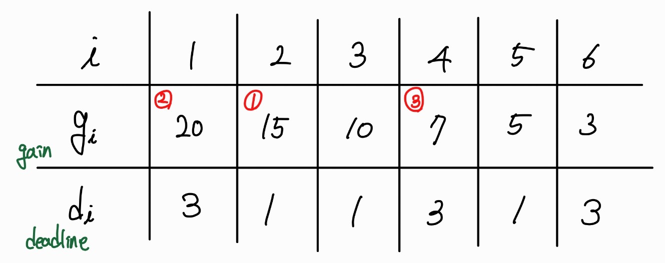 각 단계에서 아직 고려되지 않은 작업들 중 가장 높은 $g_i$ 값을 가진 것을 추가함. 단, 선택된 작업들의 집합은 가능함(feasible)을 유지해야 함.