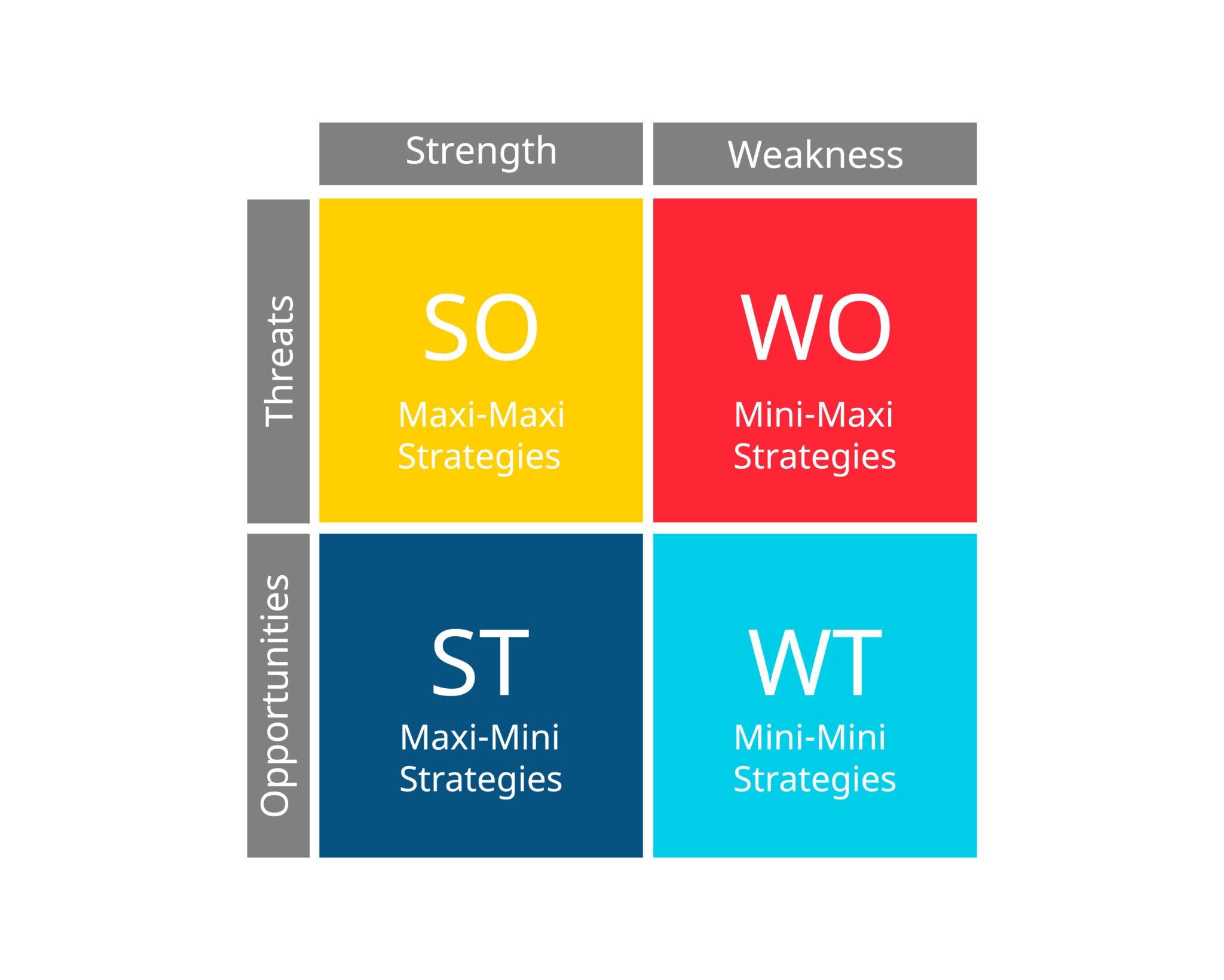 - WO 전략 (약점-기회): 자신의 약점을 보완하여 외부 기회를 활용하는 전략.